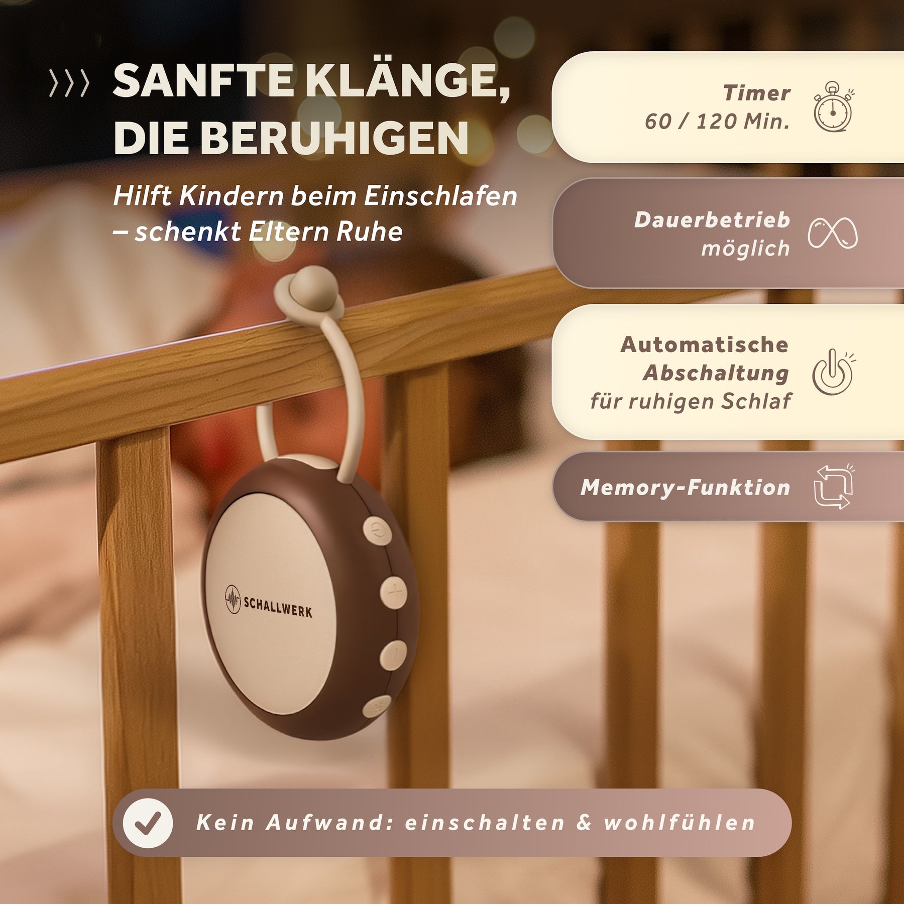 Aus 12 verschiedenen Klängen findest du immer die passende Geräuschkulisse – von beruhigendem White Noise über natürliche Pink- und Brown-Sounds bis hin zu sanften Schlafliedern. Jeder Klang ist darauf ausgelegt, Geborgenheit zu schaffen und deinem Kind das Einschlafen zu erleichtern.